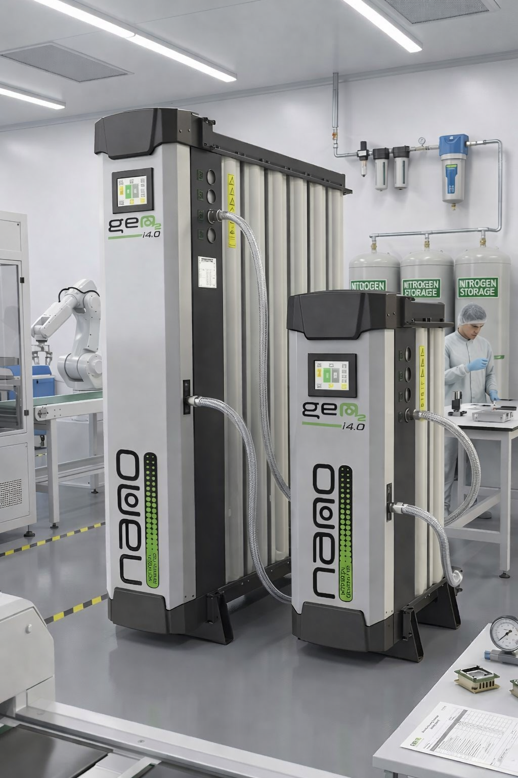 Thứ hai là sự linh hoạt về độ tinh khiết. Mỗi ngành hàng yêu cầu một nồng độ Nitơ khác nhau: thực phẩm thường cần 99% – 99.5%, nhưng ngành laser hay luyện kim có thể yêu cầu lên đến 99.999%. Máy tạo khí Nitơ hiện đại cho phép điều chỉnh thông số này một cách dễ dàng qua hệ thống điều khiển PLC.
