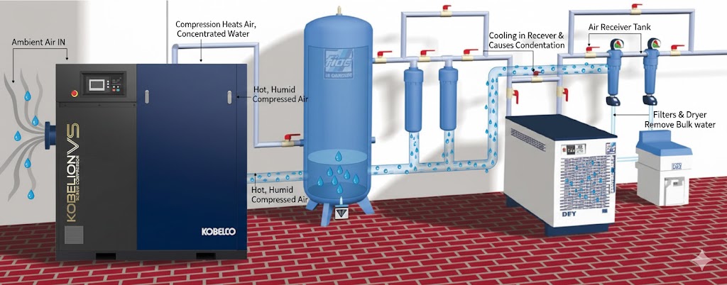 Mỗi lần khí nén đi từ vùng nóng sang vùng lạnh hơn, hơi nước lại tiếp tục ngưng tụ thêm. Do đó, nước không chỉ xuất hiện ở máy nén mà còn xuất hiện dọc theo toàn bộ đường ống và tại điểm sử dụng cuối cùng.